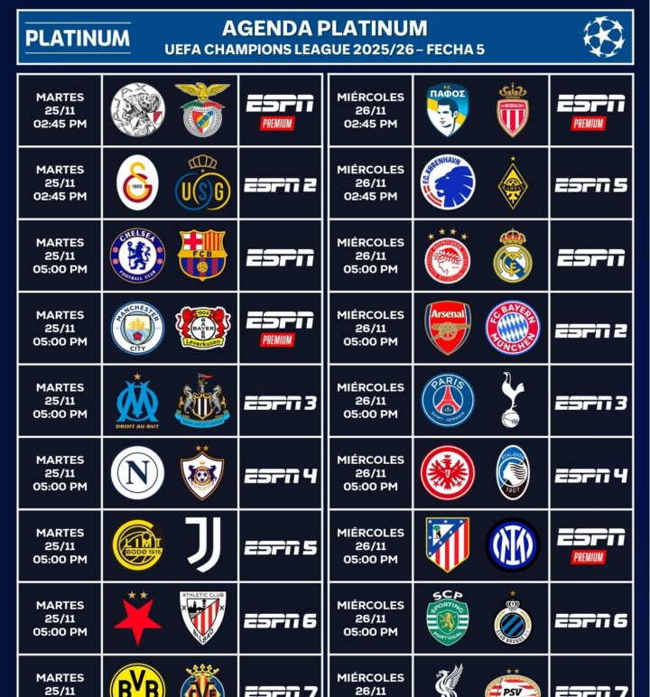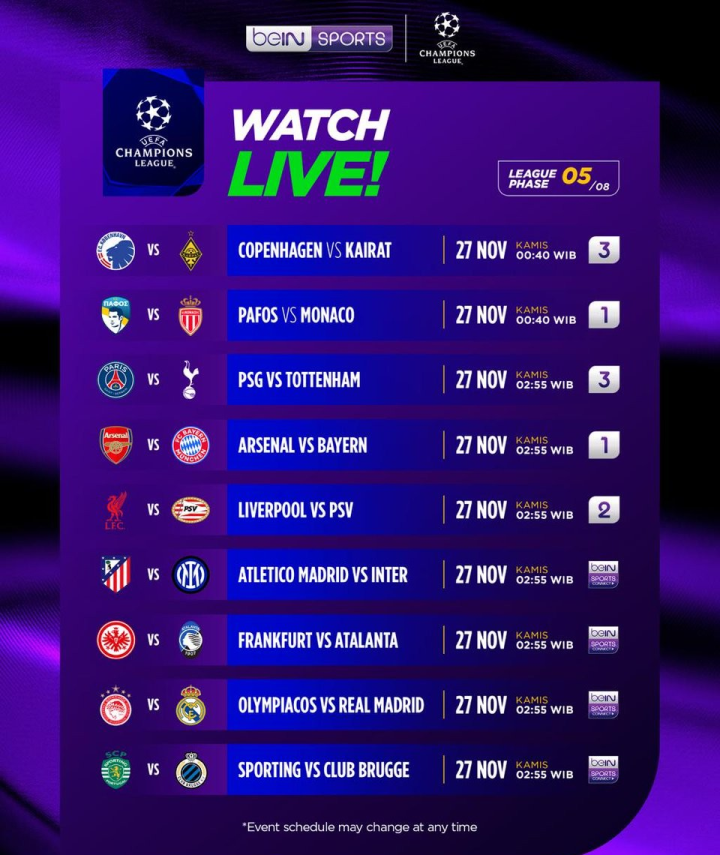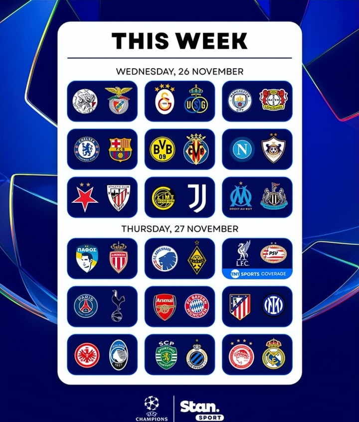 25/26赛季欧冠联赛阶段第5轮的第二个比赛日的9场比赛将继续进行。而在第二个比赛日,阿森纳vs拜仁、马竞vs国米以及巴黎对阵热刺等多场焦点对话的到来,势必也让第二个比赛日充满了极高的关注度。