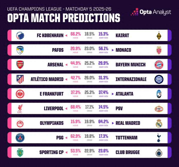 欧冠预测: 阿森纳2-2拜仁, 马竞1-1/3-2国米, 巴黎2-1/3-1热刺