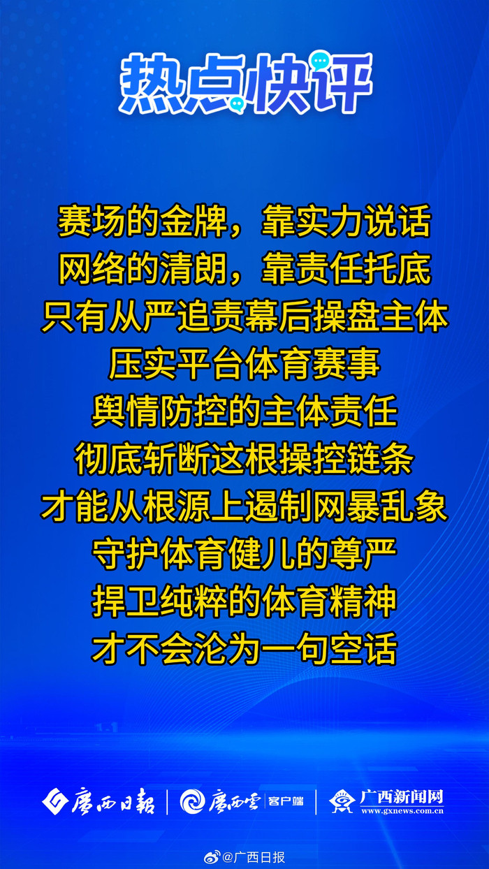赛场的金牌,靠实力说话。网络的清朗,靠责任托底。只有从严追责幕后操盘主体,压实平台体育赛事舆情防控的主体责任,彻底斩断这根操控链条,才能从根源上遏制网暴乱象,守护体育健儿的尊严,捍卫纯粹的体育精神才不会沦为一句空话。(