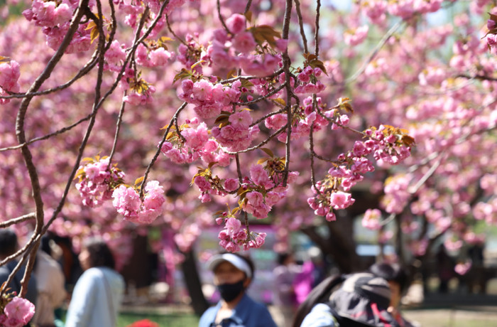据玉渊潭公园高级工程师胡娜介绍,公园晚樱以关山、松月、普贤象等品种为主。与早樱单瓣、花朵小巧不同,晚樱为重瓣花朵,层层叠叠,近观如锦簇团花,远望似绯红云霞。除了常见的粉色、白色品种,园内还有黄绿色的郁金和须磨浦普贤象,清新脱俗,为繁花似锦的春日增添一抹别致色彩,晚樱的观赏期可持续至四月中下旬。