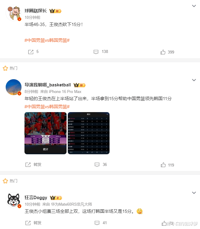 第二节王俊杰都是扛着人上篮啊,第一次不中被余嘉豪补中,第二次扛着李贤重上进。男篮陷入得分荒被韩国缩小到2分,王俊杰弧顶三分稳定战局,王俊杰空切到篮下压哨命中,王俊杰成为第一个上双的男篮球员。王俊杰补篮得手,王俊杰外线三分再中,半场15分已经创造国家队生涯新高。