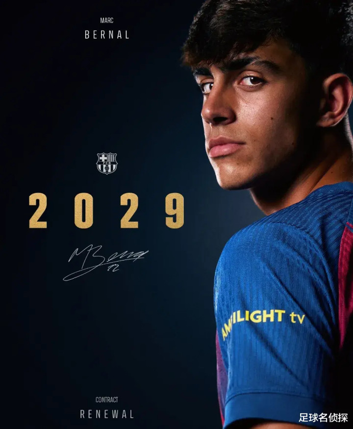 官方:巴萨宣布和18岁的中场新星马克-伯纳尔续约到了2029年。