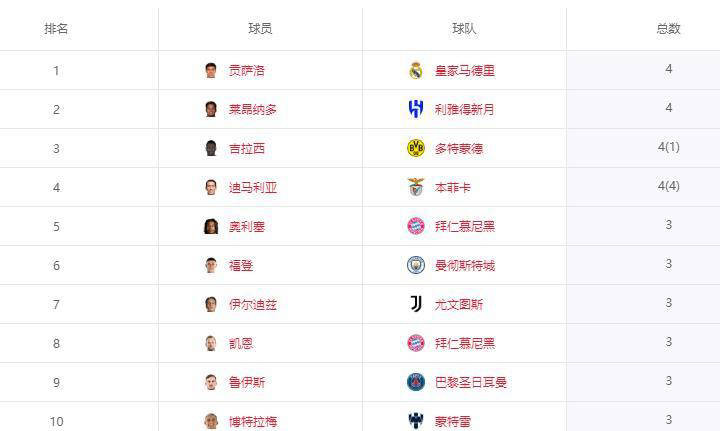 此外,目前射手榜前四名的球员均已回家,包括皇马的贡萨罗、利雅得新月的莱昂纳多、多特蒙德的吉拉西和本菲卡的迪马利亚。如果决赛进球寥寥,四球的球员反而会有资格争夺金靴,这确实是引人注目的“神剧情”。