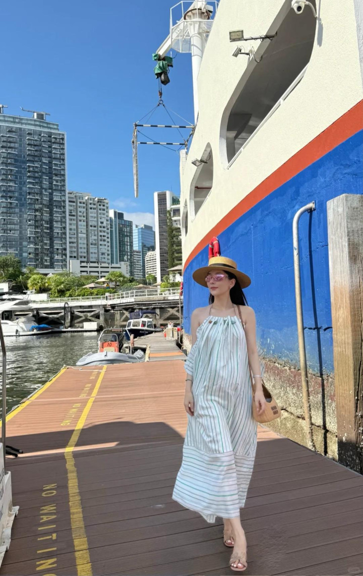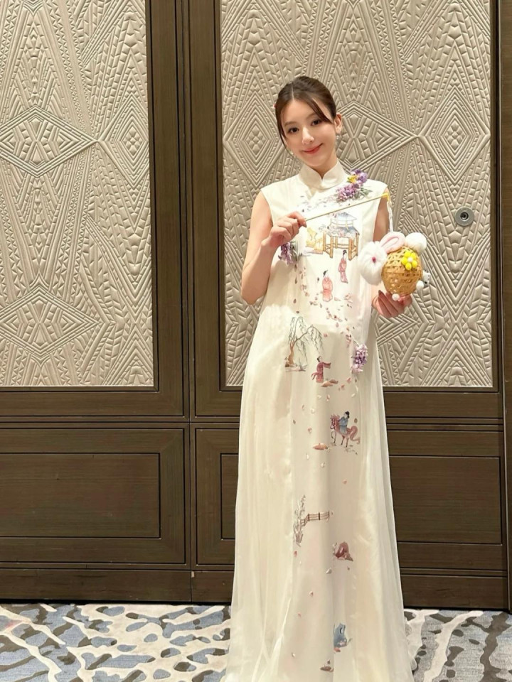 晒出的照片里穿着米白色连衣裙,站在栏杆边,肚子虽然隆起但四肢还是那么细。