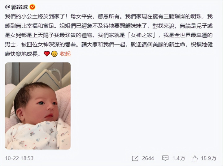 仔细看郭富城的微博文案,用了“三颗璀璨的明珠”而不是之前二胎时的“小公主”,称呼上的变化已经很说明问题。